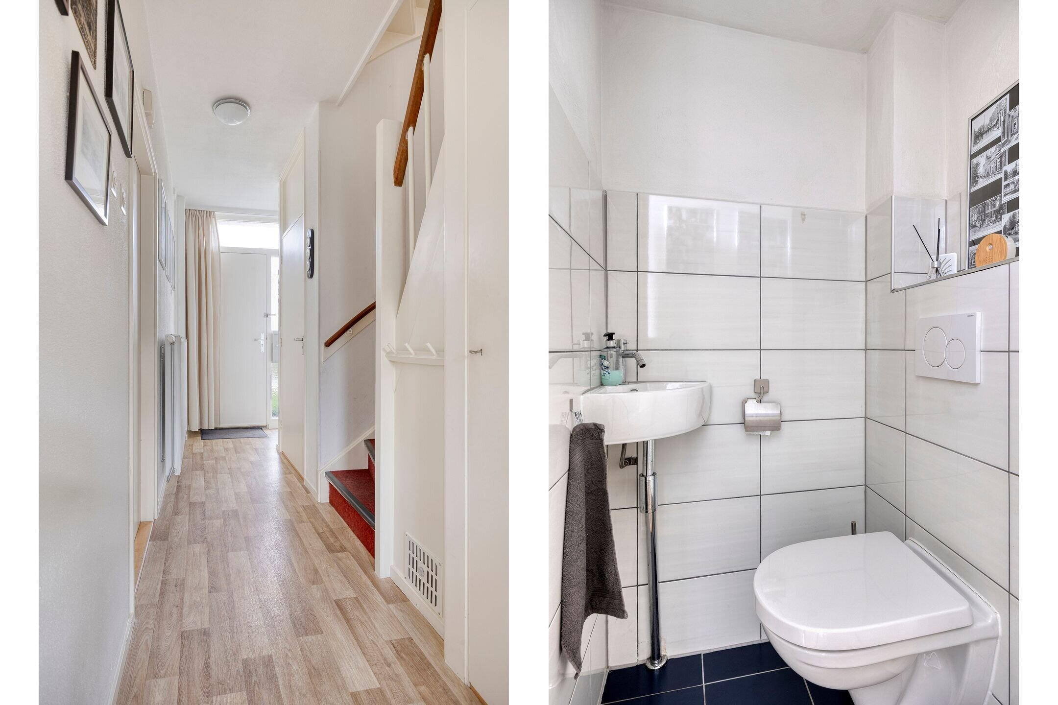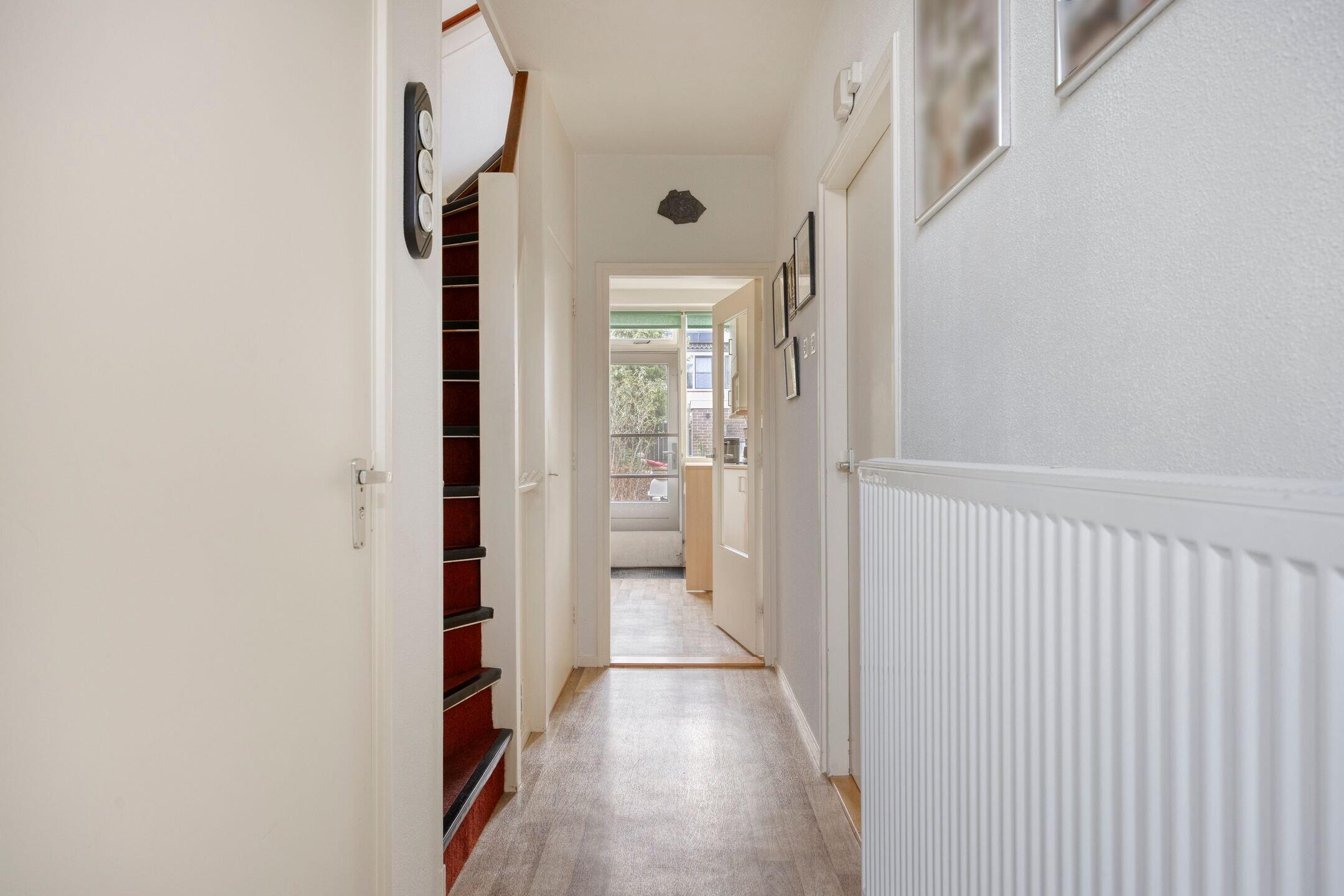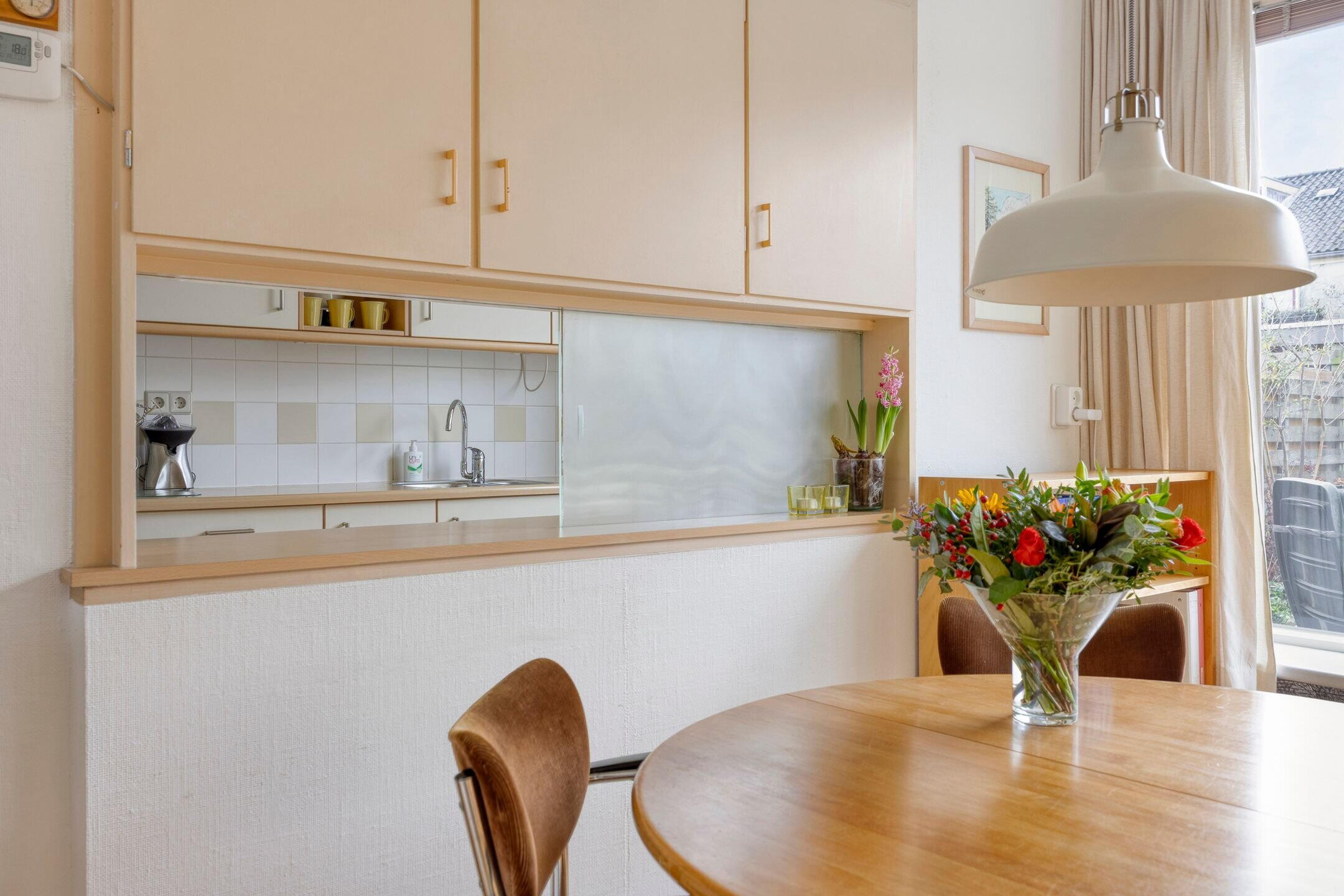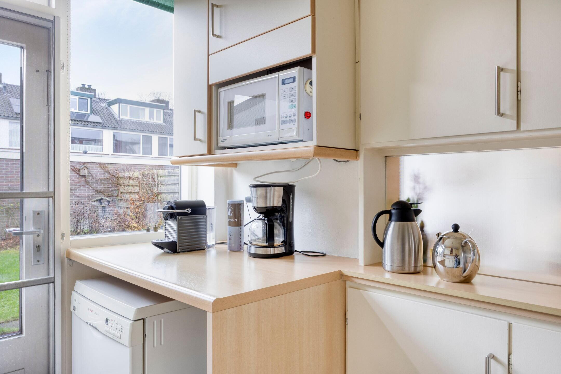 Entree, hal, toilet met fontein, provisiekast, ruime en lichte woonkamer met grote raampartijen en toegang tot de tuin, dichte keuken met net keukenblok voorzien van diverse inbouwapparatuur en close-in boiler, vaste kasten en deur naar de zonnige achtertuin.