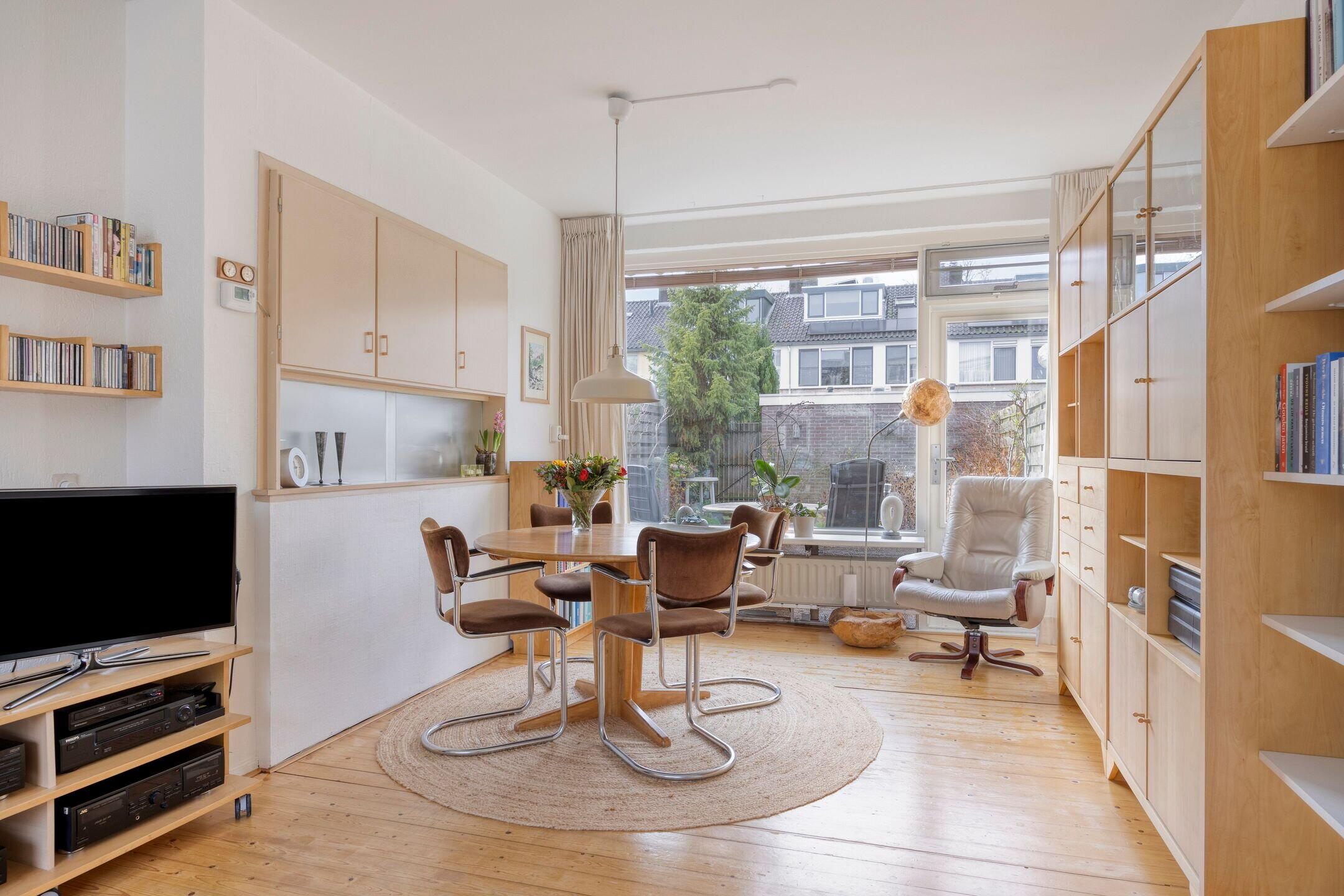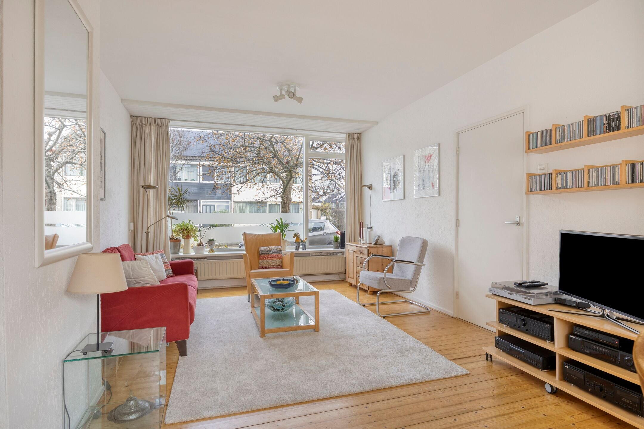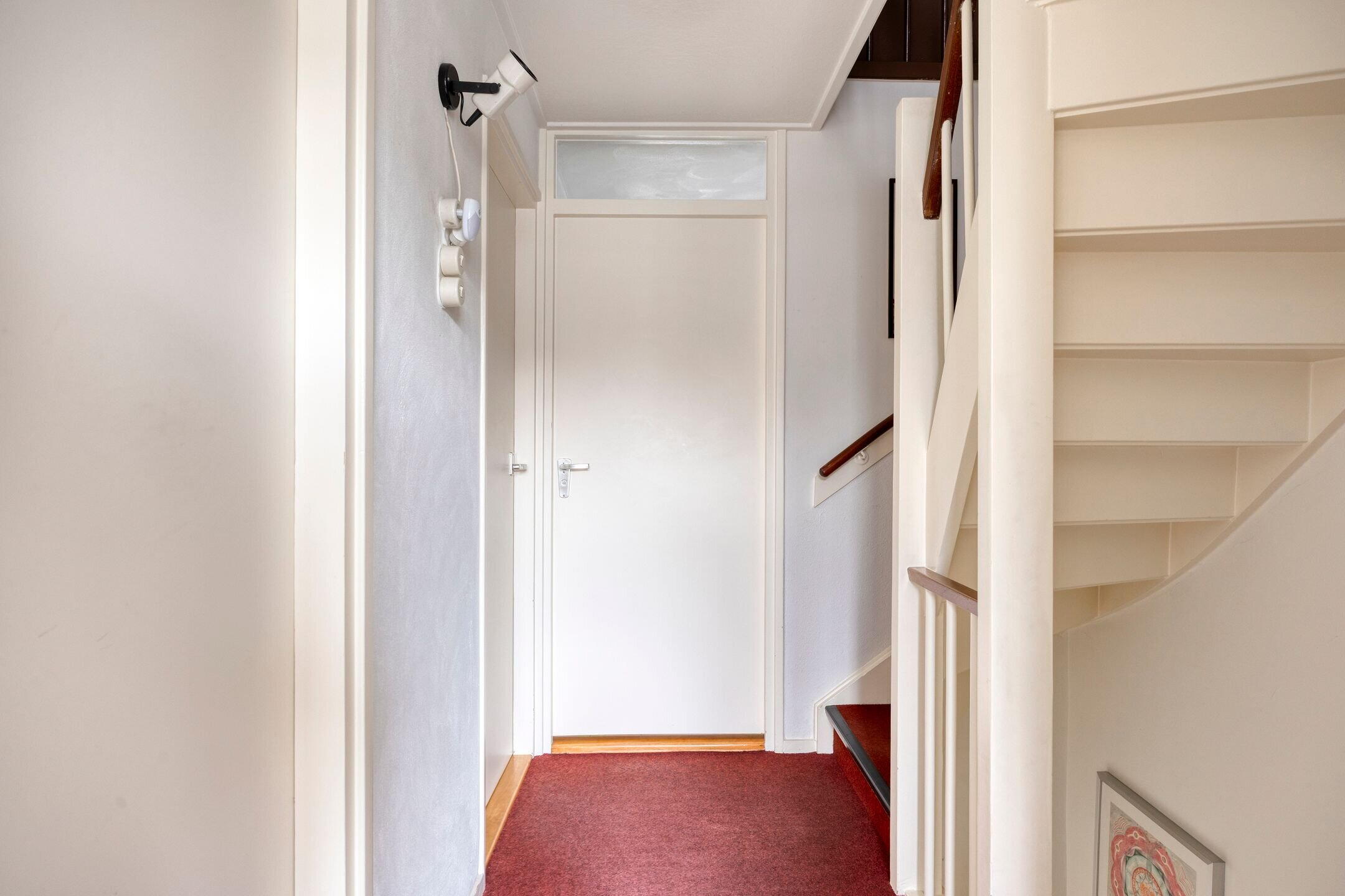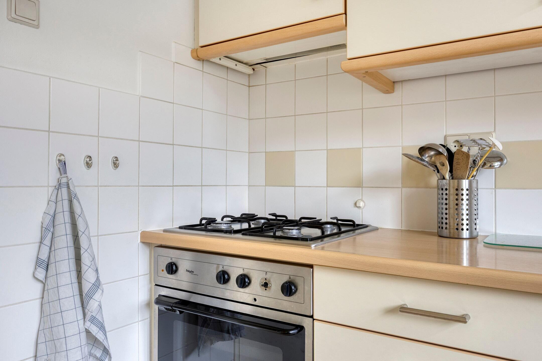 Entree, hal, toilet met fontein, provisiekast, ruime en lichte woonkamer met grote raampartijen en toegang tot de tuin, dichte keuken met net keukenblok voorzien van diverse inbouwapparatuur en close-in boiler, vaste kasten en deur naar de zonnige achtertuin.